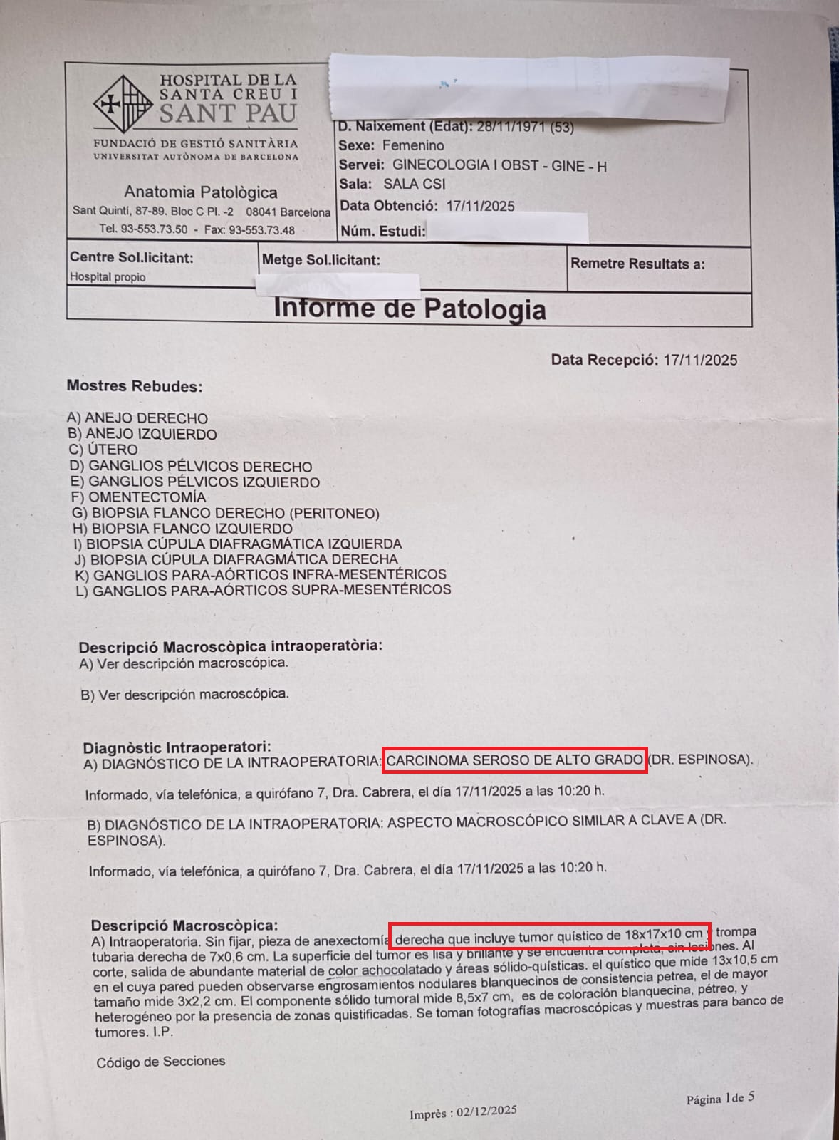 The Active Phase began in September 2023: her father had to undergo emergency surgery for several tumors in the urinary bladder; the right ovary began to show changes that were presented in the gynecological check-up in June 2024.